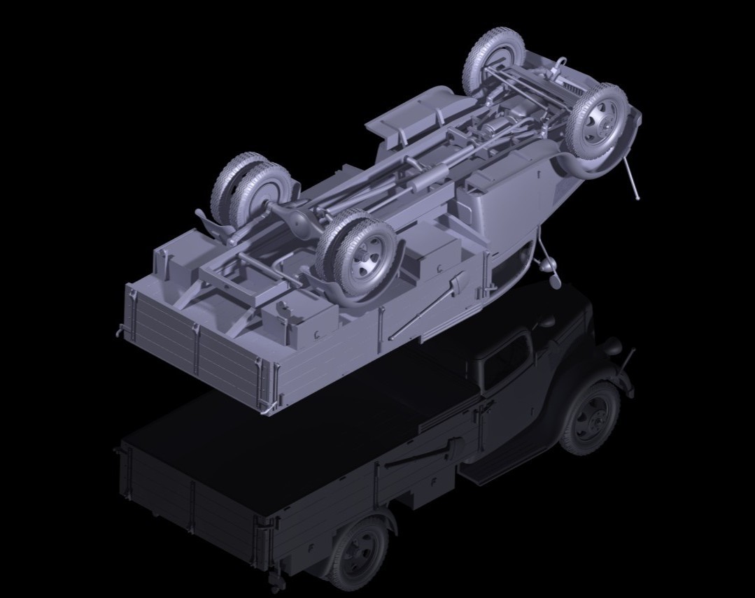 Детализированная подвеска, проработанный задний мост, кардан, рессоры, сборная несущая рама, выхлопная система выполнена отдельной деталью.